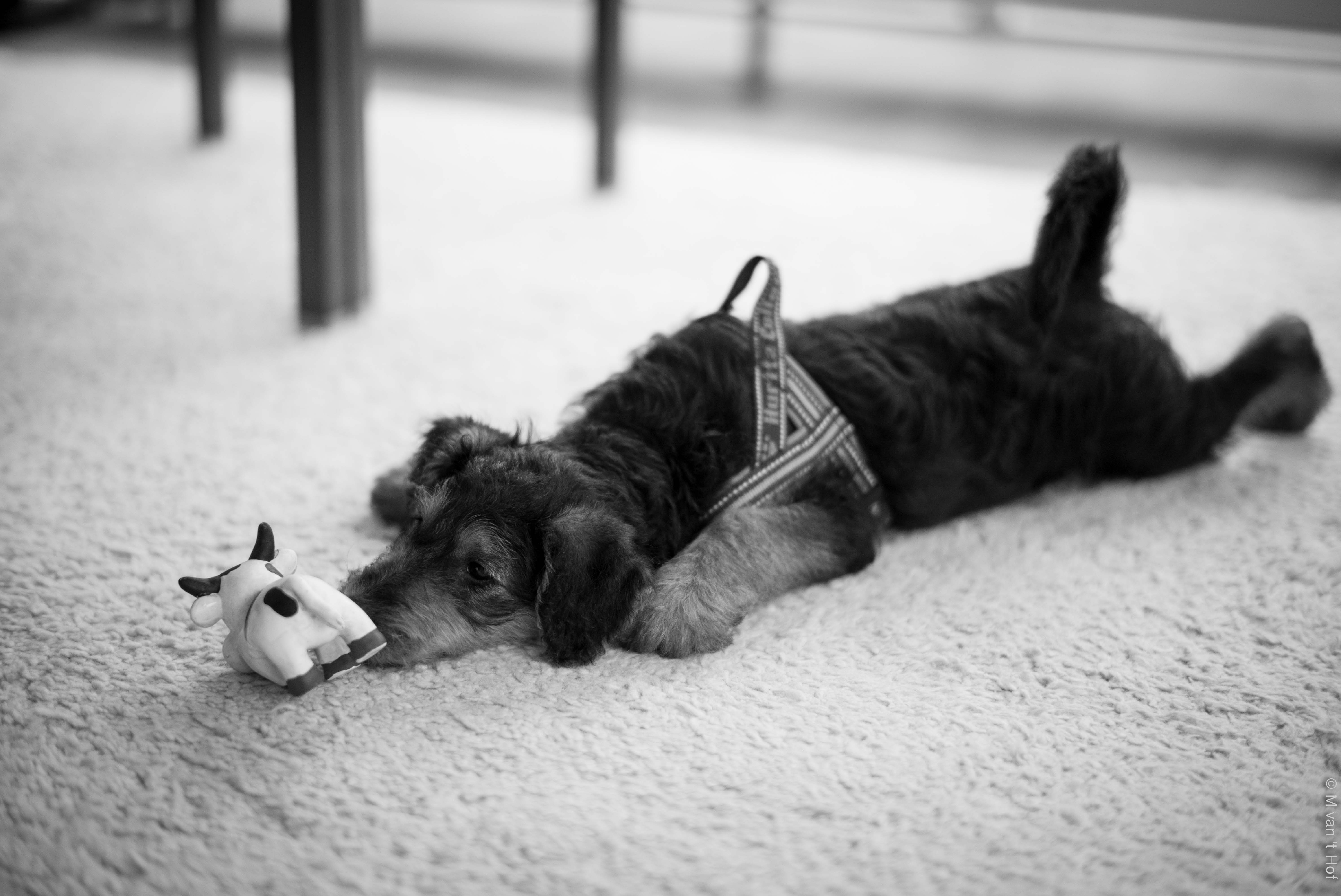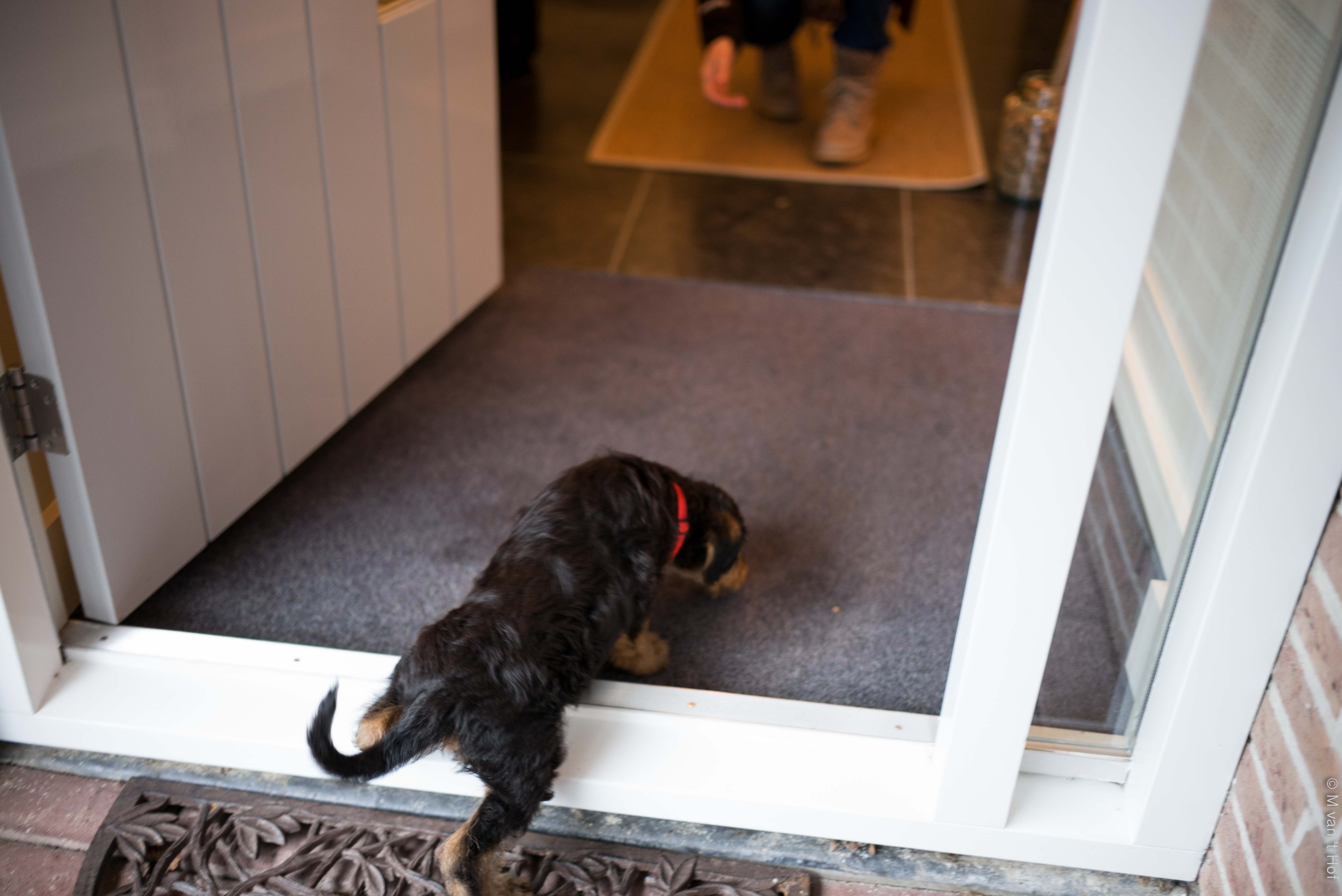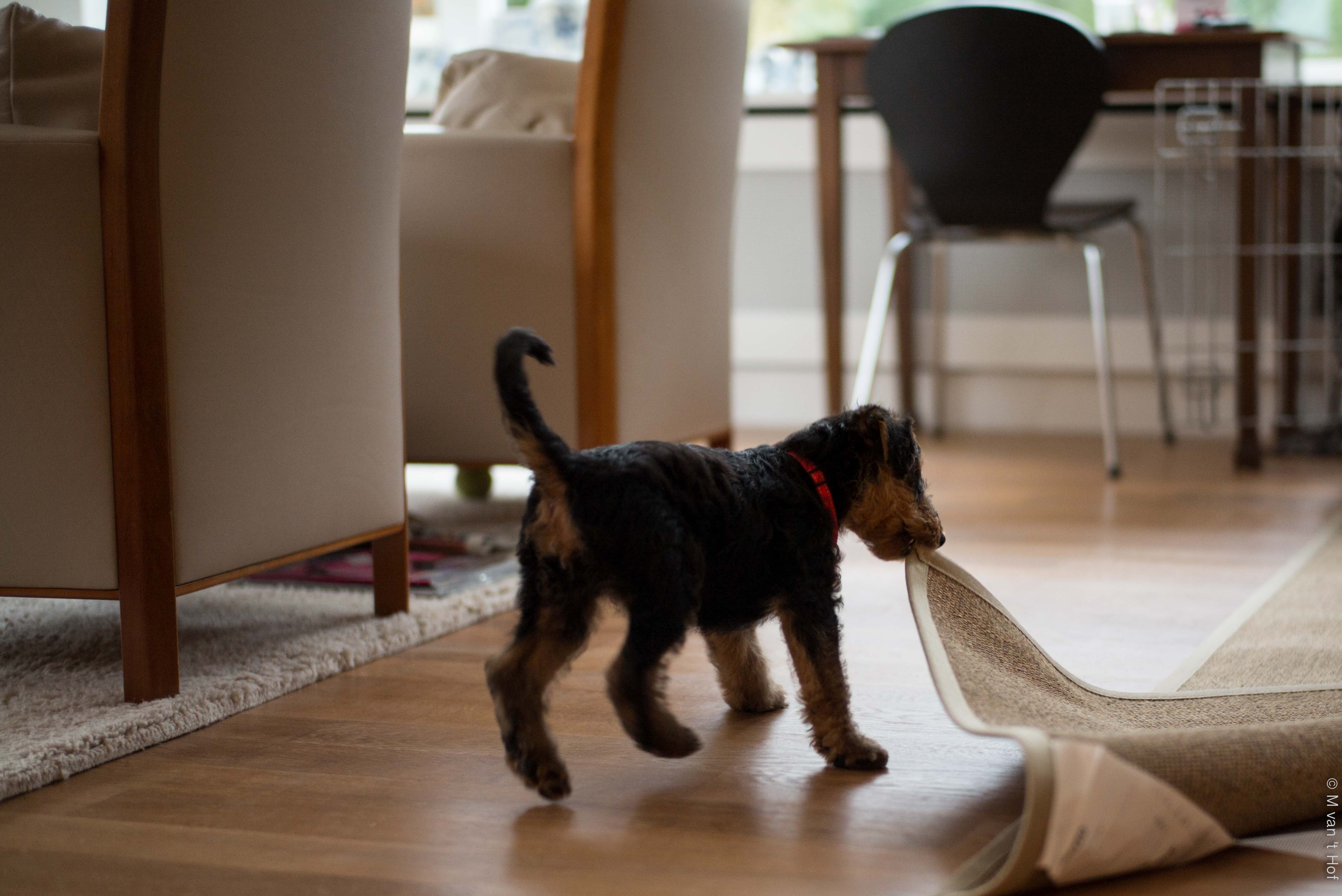 In huis is het opletten. Ze weet niets, is een baby’tje, blanco, dus alles moet je haar leren. Aan haar floss-touw mag ze trekken, maar niet aan de gordijnen. Kluiven mag ze op een botje maar niet aan de tafelpoten. Kaarsjes zijn om te branden, niet om op te eten. Ze is dol op vloerkleden, schoenen, veters, m’n schaapwollen sloffen, boeken, kranten, bloemen etc. Ze bijt graag in onze handen, voeten, broekspijpen en laarzen. Het hoort erbij, met hun vlijmscherpe tandjes ontdekken puppy’s de wereld.