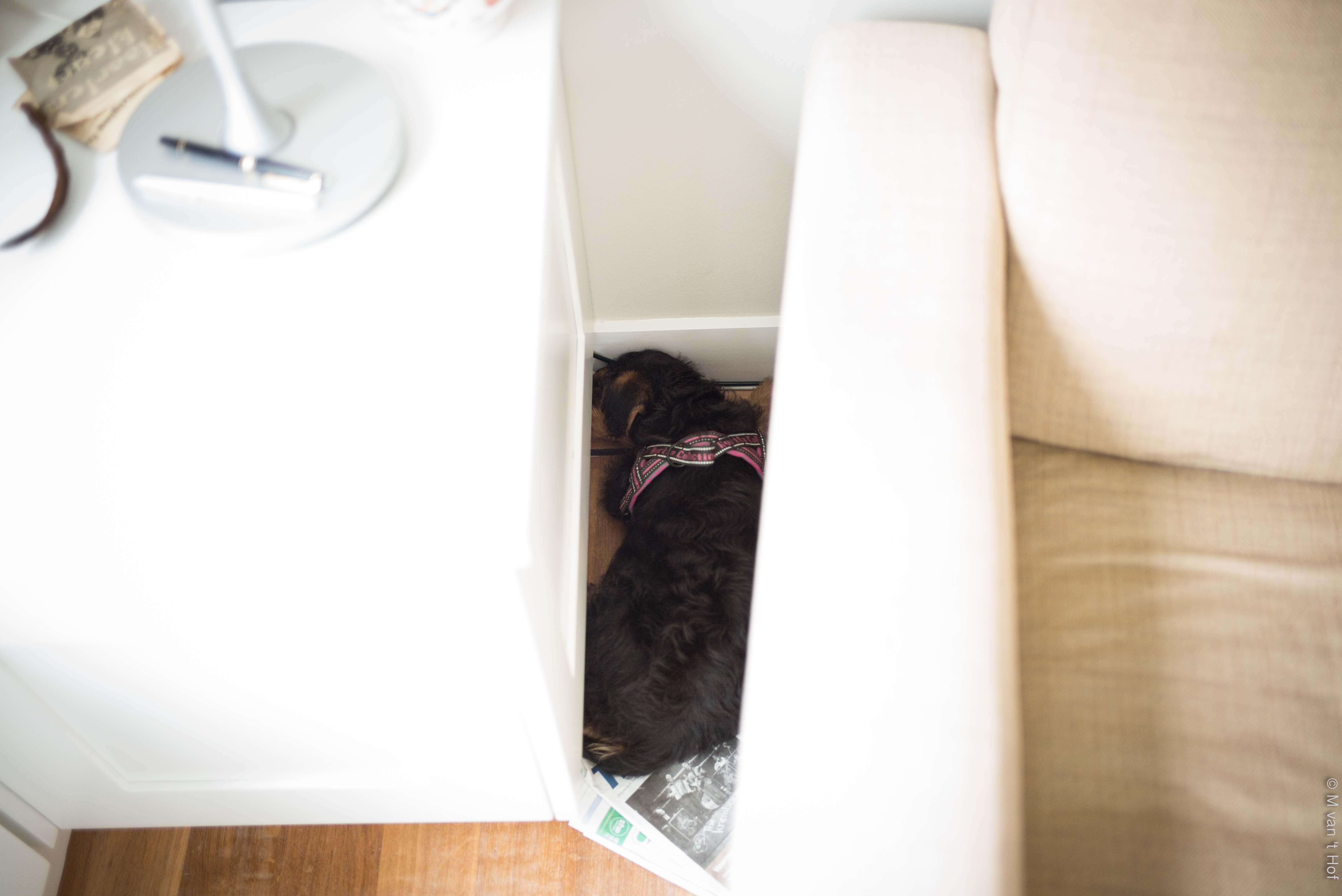 Ze is leergierig en oefeningetjes als zit, blijf en ‘hierkomen’ gaan spelender wijs. Ze heeft al haar eigen-aardigheden. Ze ligt graag in hoekjes, tegen een kast of stoel, tussen de dorpel-radiator en het raam, of onder de tafel of trap. Ik ben haar al een paar keer ‘kwijt’ geweest, dan lag ze ergens verstopt. Ook ligt ze graag aan onze voeten, dat is lief en lekker warm.