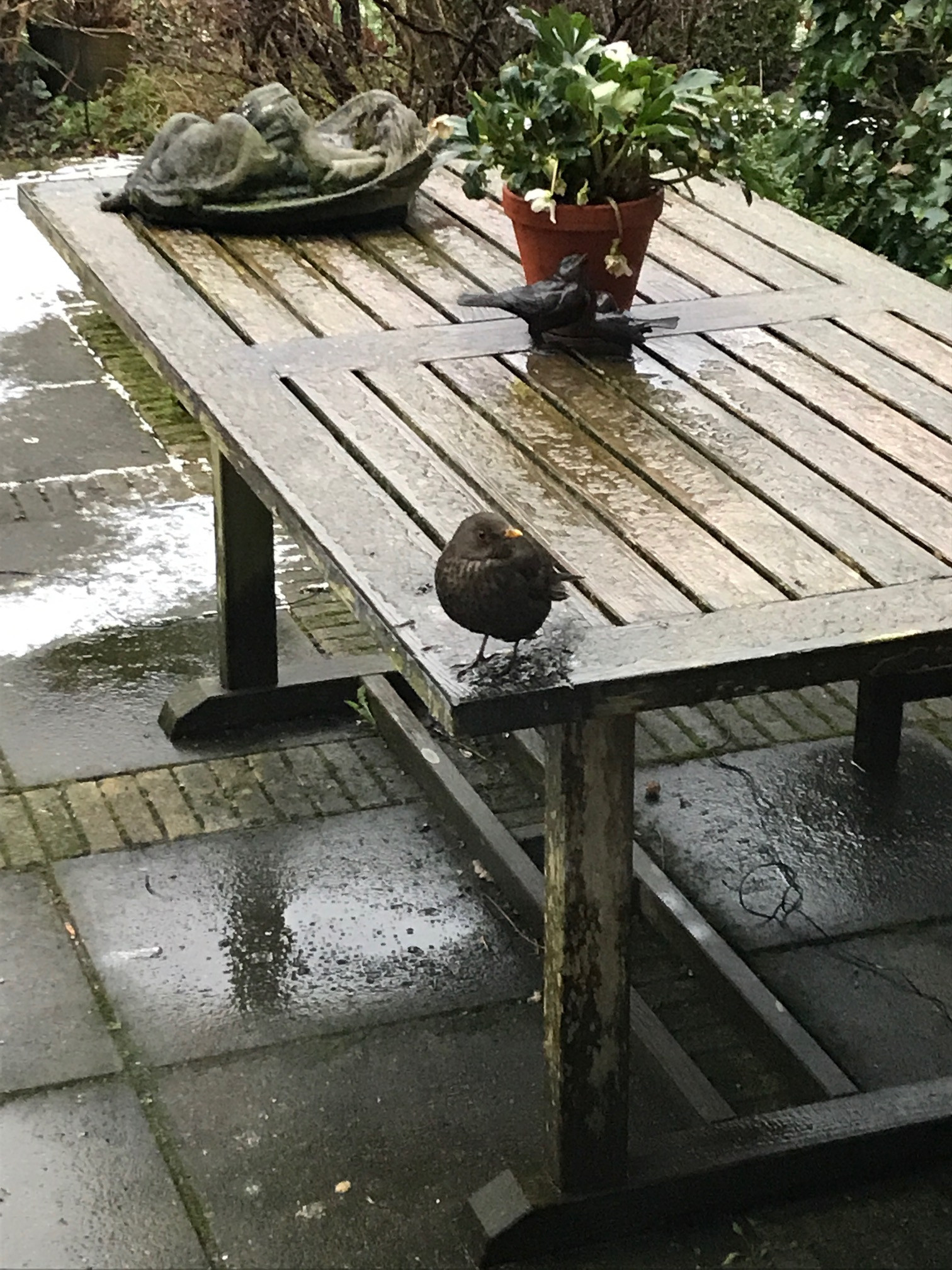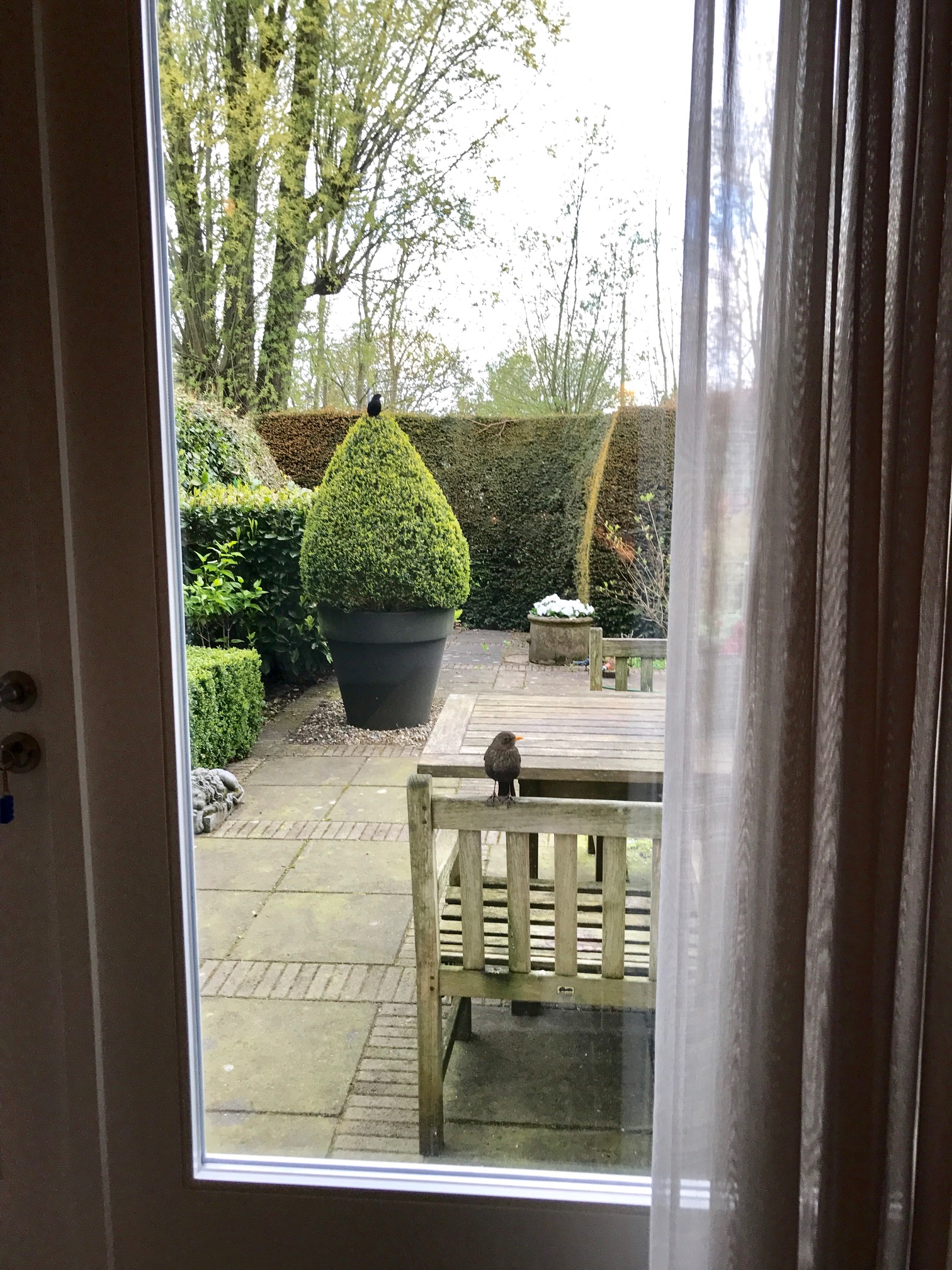 Van de week zat ik in de woonkamer bij het raam, wat te schrijven. En daar kwam merelvriendin aanvliegen, ze ging op de tuinbank voor me zitten. Alsof ze wilde zeggen ‘he ik ben er, heb je me gezien? ik wil wat lekkers’.